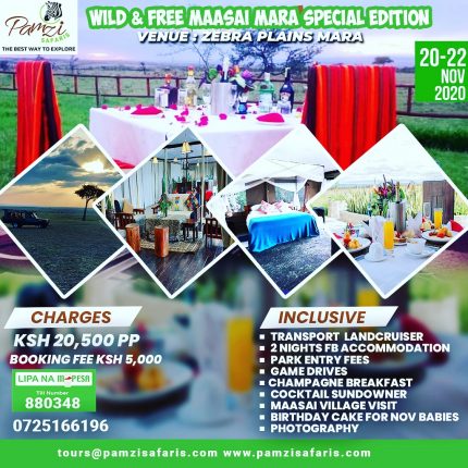 Experience the 7th Wonder of the World right here in Kenya at Maasai Mara. The wildebeest migration has started don’t miss out. For only kshs 14,700 for 3 days 2 nights . Don’t wait to hear the story, lipa Pole Pole also available